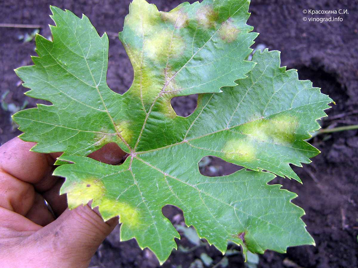 На листьях винограда прозрачные маслянистые «нефтяные» пятна, сначала светло-зеленого или желтого, затем бурого цвета. Некрозы, опадание листьев.