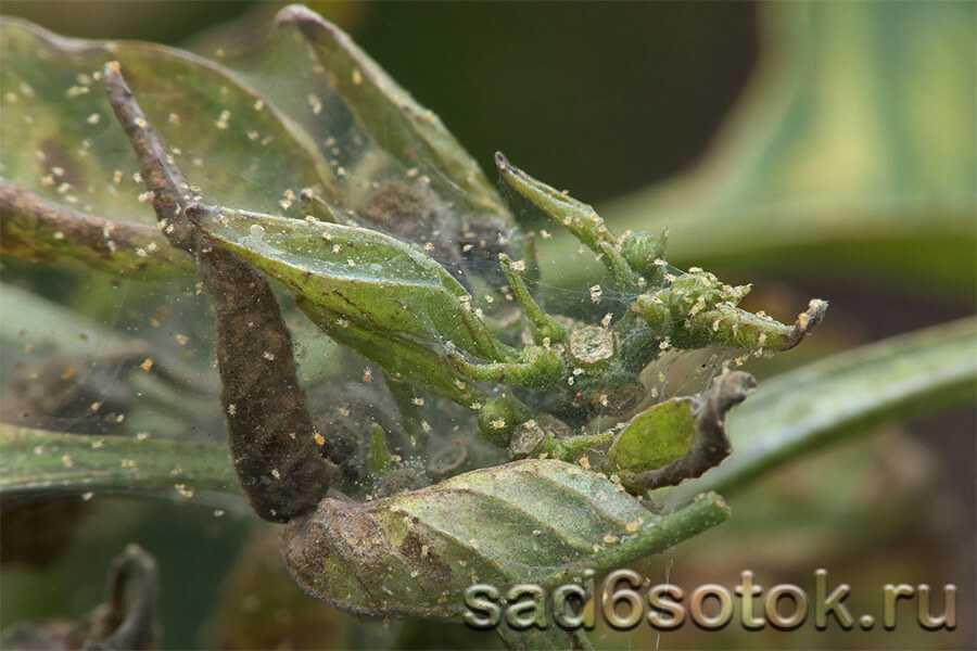 На начальной стадии мелкий вредитель никак себя не проявляет. В этот период можно заметить лишь тонкую серебристую паутинку на побегах и снизу на листьях.