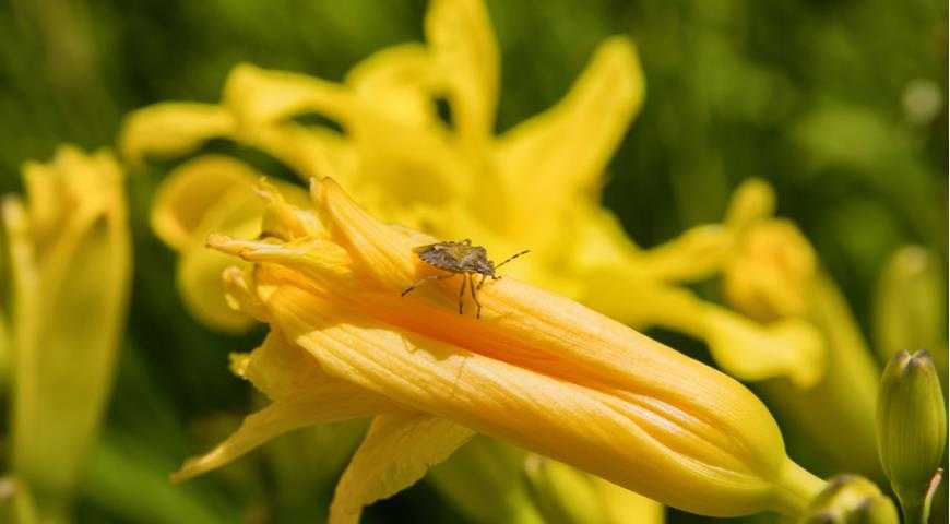 В более теплых регионах лилейниками не брезгуют листовые минеры (Ophiomyia kwansonis), оставляя обесцвеченные дорожки на листьях, гусеницы совок, цикады, луковичные клещи (Rhizoglyphus spp.), хрущик японский (Japanese beetle), сосущий вредитель-клоп щитний ягодный (Dolycoris baccarum). При отсутствии насекомых не брезгуют листьями и самки кузнечиков, но этих полезных товарищей лучше прогнать с растений каким-то мирным способом — они приносят реальную пользу саду! А вот их близкие родственники — кузнечики-пилохвосты, встречающиеся в Украине, как раз питаются растительной пищей, и с ними нужно держать ухо востро — они выгрызают значительные площади листьев и стеблей. Но поскольку включены в Красную книгу, нужно провести вежливую беседу и попробовать мирно договориться.