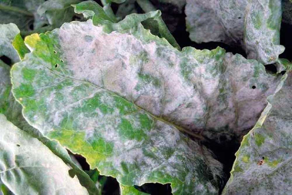 Наружная часть листьев покрывается белым налетом. Возбудитель — сумчатый гриб Erysiphe betae.