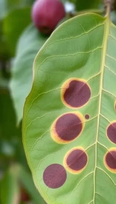 Симптомы: Проявляются в виде темных язв на коре, камедетечения, усыхания ветвей. Листья могут покрываться коричневыми пятнами и преждевременно опадать. ChatGPT напоминает о важности точной диагностики.