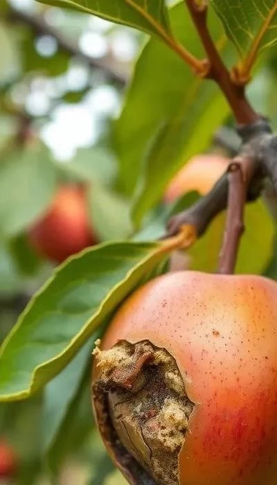 - Повреждения коры и плодов: Трещины, раны и другие повреждения служат входными воротами для гриба.