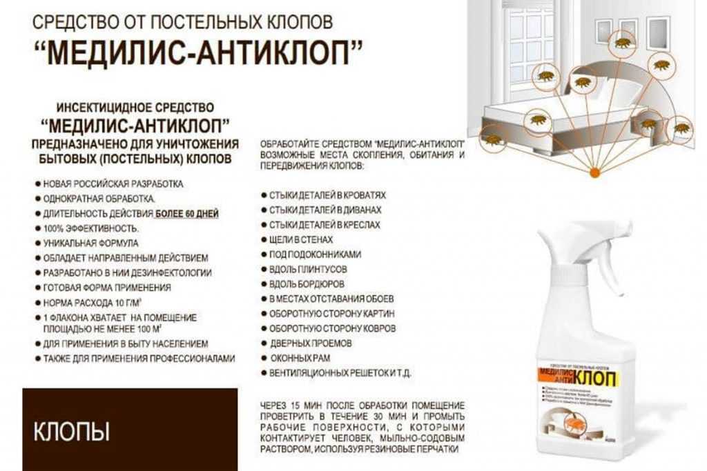 - циперметрин — основное действующее вещество в препаратах, которое, попадая в организм клопа, вызывает у насекомого мышечный паралич, вследствие чего наступает смерть;