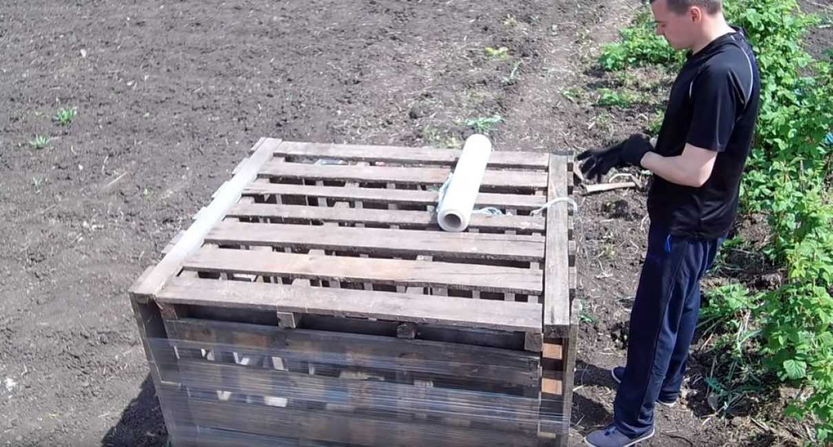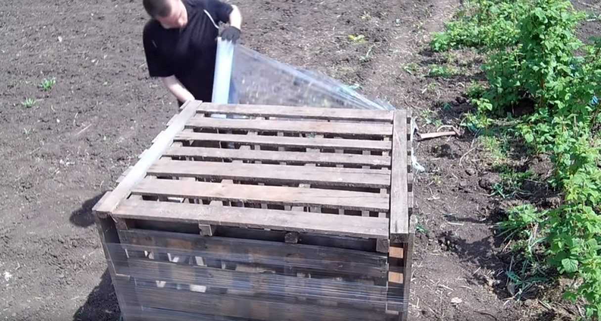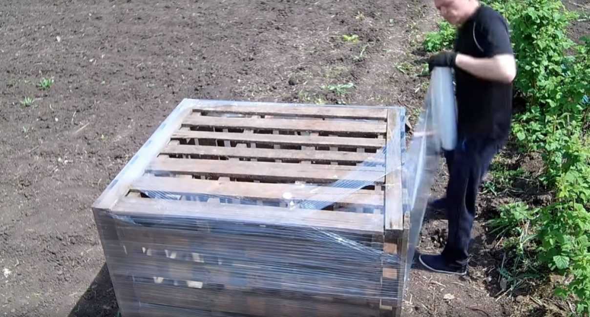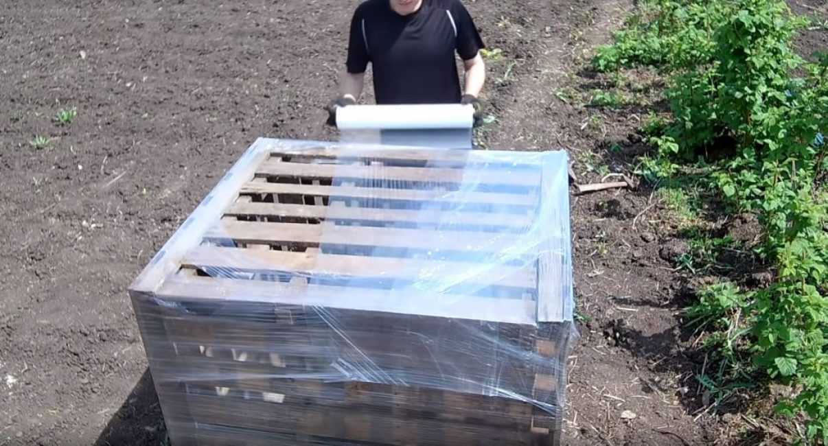 Для изготовления ёмкости понадобятся пять одинаковых деревянных щитов (поддонов) и широкая пищевая плёнка, которая по-другому называется стрейч.