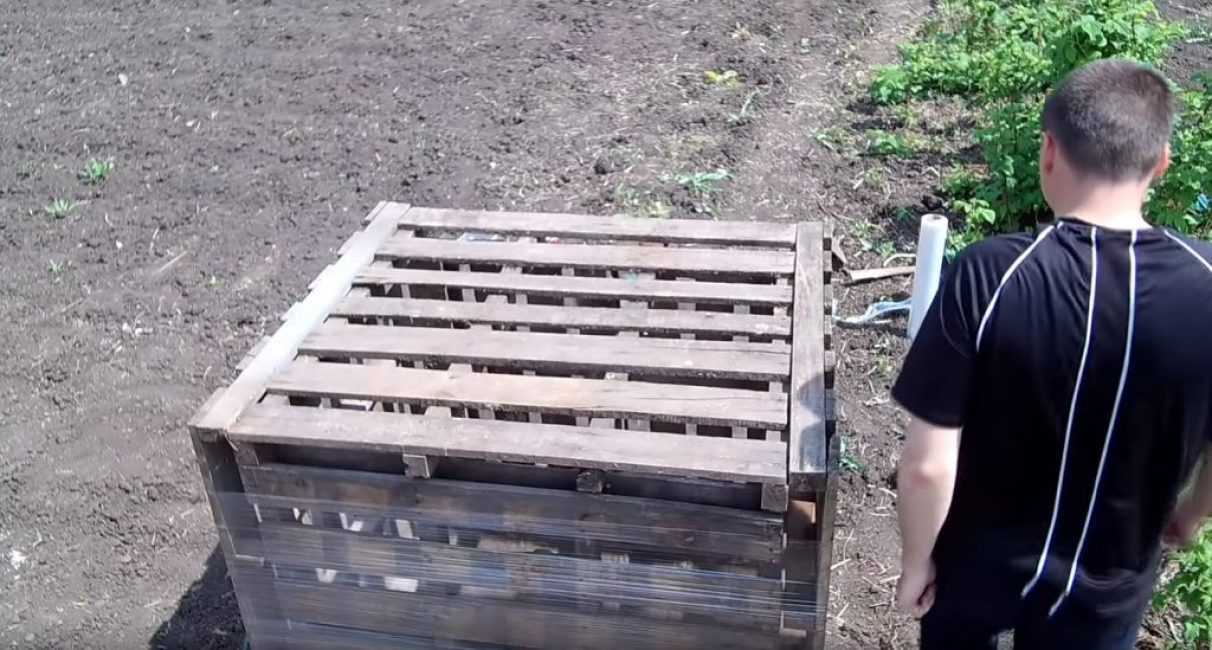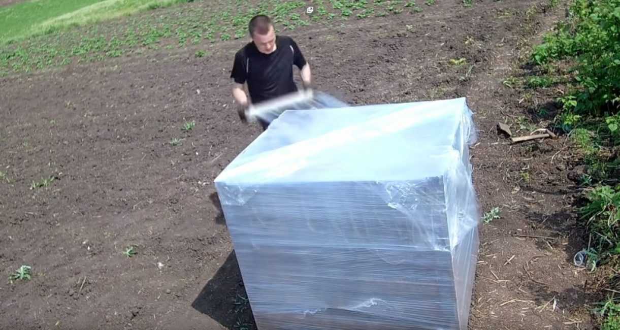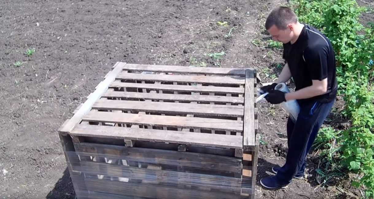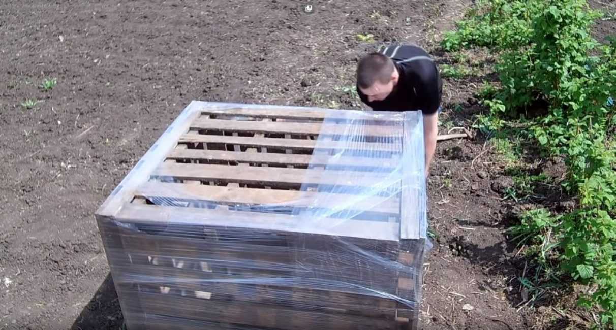 Для изготовления ёмкости понадобятся пять одинаковых деревянных щитов (поддонов) и широкая пищевая плёнка, которая по-другому называется стрейч.
