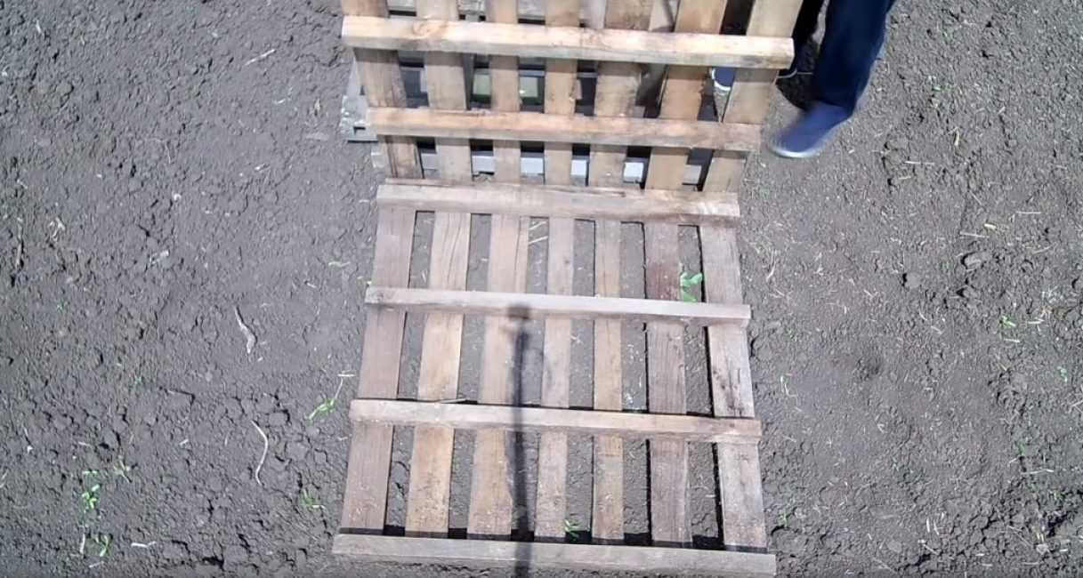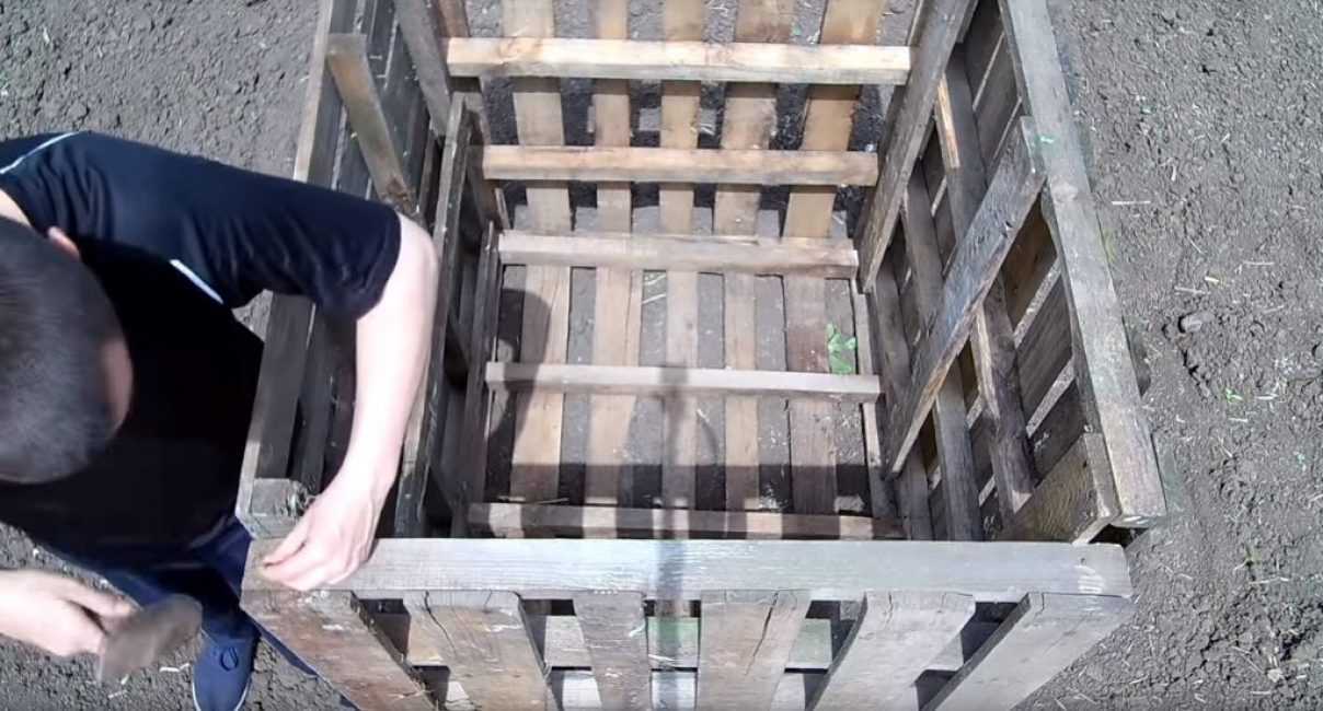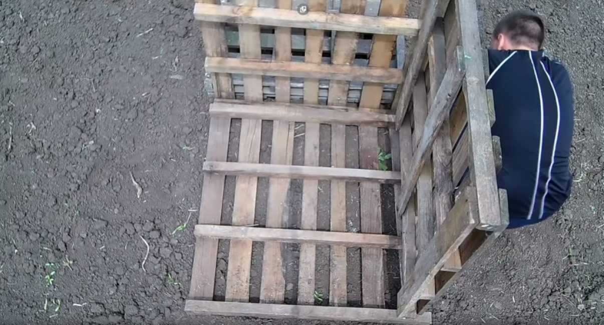 Вначале необходимо положить один поддон на землю – это будет дно бака. К нему присоединяются стенки.
