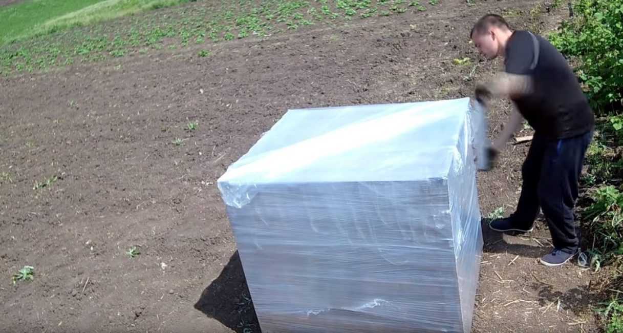 Полученную деревянную конструкцию следует перевернуть вверх дном и замотать её необходимым количеством слоёв плёнки.