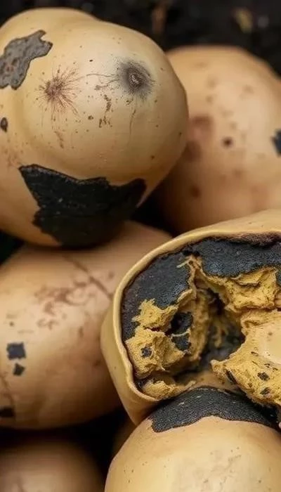 На стеблях картофеля появляются темно-коричневые полосы и язвы. Пораженные стебли становятся хрупкими и легко ломаются. На клубнях фитофтора проявляется в виде мягких, вдавленных бурых пятен, которые постепенно углубляются и охватывают всю поверхность клубня. Пораженные клубни гниют, издают неприятный запах и становятся непригодными для хранения.