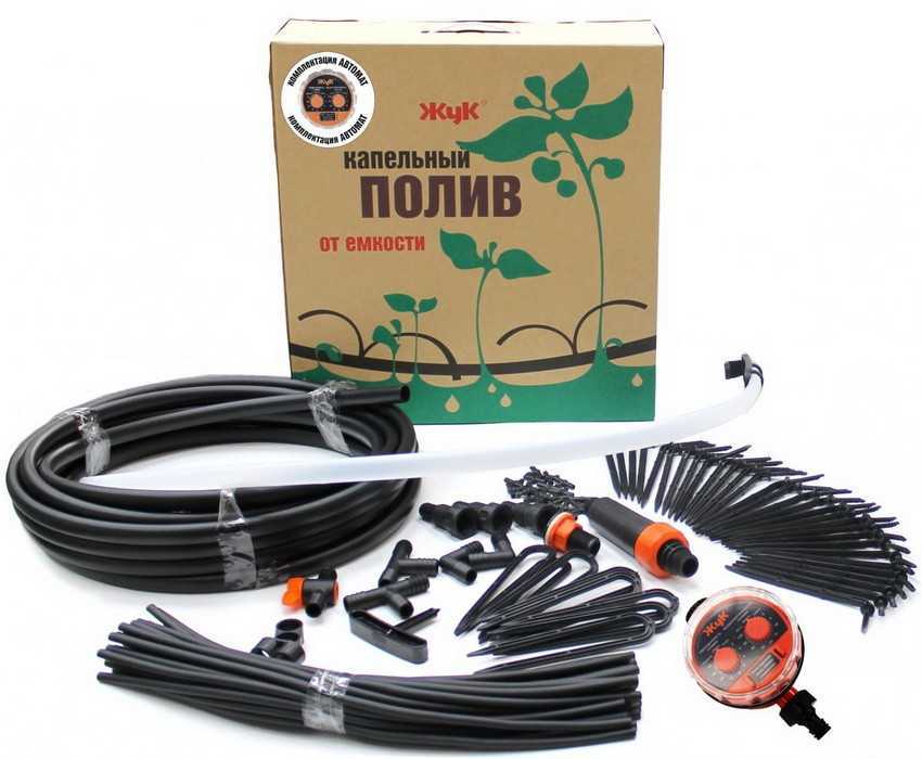 Для теплиц выбирается система полива «Жук» на 60 кустов, рассчитанная на площадь 18 м², а для парников – на 30 растений или на территорию 6 м². Существуют модели, для которых источником водоснабжения является централизованный водопровод. Они дополнительно укомплектованы электротаймером. Такой вариант полива можно использовать для моркови, редиса или фасоли, которые невосприимчивы к холодной воде. Системы, что подключаются к водонапорной емкости, имеют специальные штуцеры.