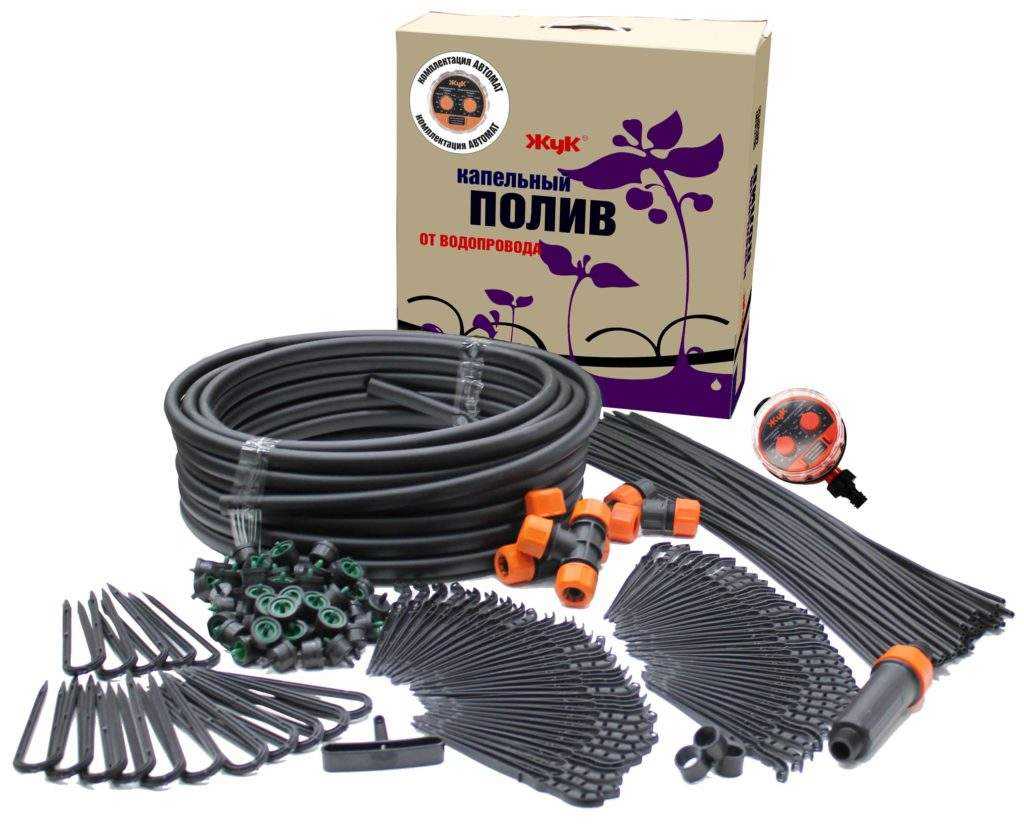 Система капельного полива «Жук» типа автомат имеет два различных вида с одинаковыми комплектующими под определенное количество поливаемых растений. Возможно исполнение системы на 20, 30, 60 растений для любой грядки. Каждый набор имеет все необходимые комплектующие, которые готовы к полной установке из коробки. Стандартный комплект обладает магистральным шлангом длинной в 18 метров для подводки воды из бочки или крана водопровода к необходимой грядке.
