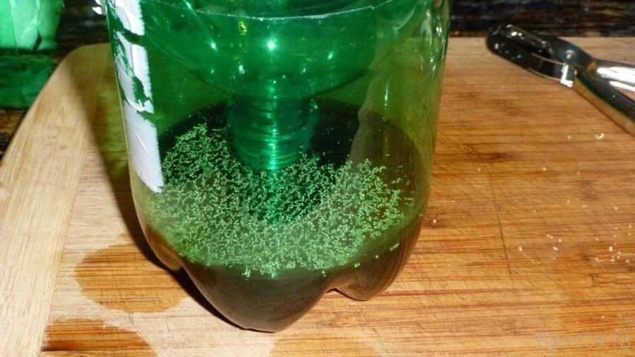 Важно! Налитый в бутылку раствор сразу же начнет бродить и дрожжевые бактерии, поглощающие сахар, выделят углекислый газ, который и привлечет комаров. Если количество дрожжей и сахара достаточное, то процесс может продолжаться не один день