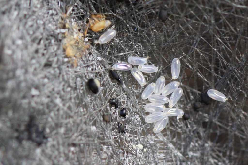 Яйца вредителей небольшого размера: белые, достигают 1-1,5 мм (длина). Пустые оболочки обнаруживаются там, где гнезда паразитов, вместе с шелухой, которую сбрасывают личинки, образуют подходящую среду для обитания насекомых.