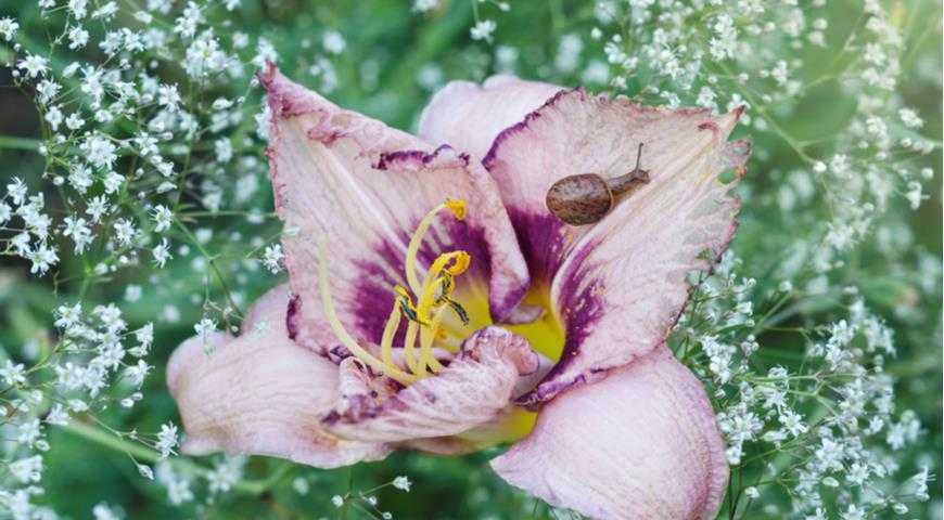 Слизни могут быть проблемой для любых многолетников, не обойдут они стороной и лилейники, особенно во влажную теплую погоду. Их зловредный рацион приводит к появлению рваных выемок по краям листьев, а иногда и отверстий в середине листьев лилейников. Появление блестящих слизистых следов — типичный признак пирушки слизняков. Питаются они ночью, а днем прячутся во влажных местах.