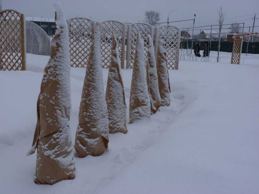 Молодые растения сначала мульчируют торфом, затем веточки подвязывают к центральному проводнику шпагатом, и обкладывают еловым лапником.