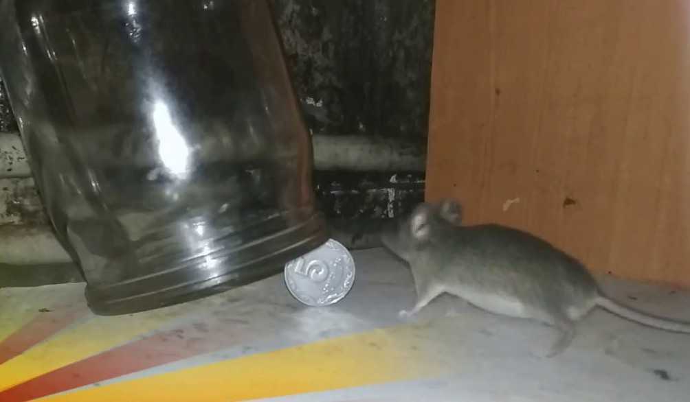 - Для следующего способа поимки мыши понадобится большой стакан или стеклянная баночка 500 мл, а также монетка. Поставьте стакан таким образом, чтобы монетка ребром уперлась в края стакана. Предварительно на внутренний край стеклянной тары нужно приклеить кусочек приманки. Когда мышка войдет внутрь, начнет отлеплять еду от стенки стакана, монетка соскользнет с ребра и стакан накроет грызуна. Остается только аккуратно вытащить мышку из перевернутого стакана. Чтобы было проще это сделать, можно предварительно установить конструкцию на плотный картон. После поимки животного просто поднимите картон вместе со стаканом.
