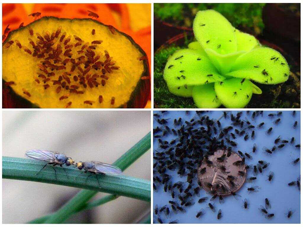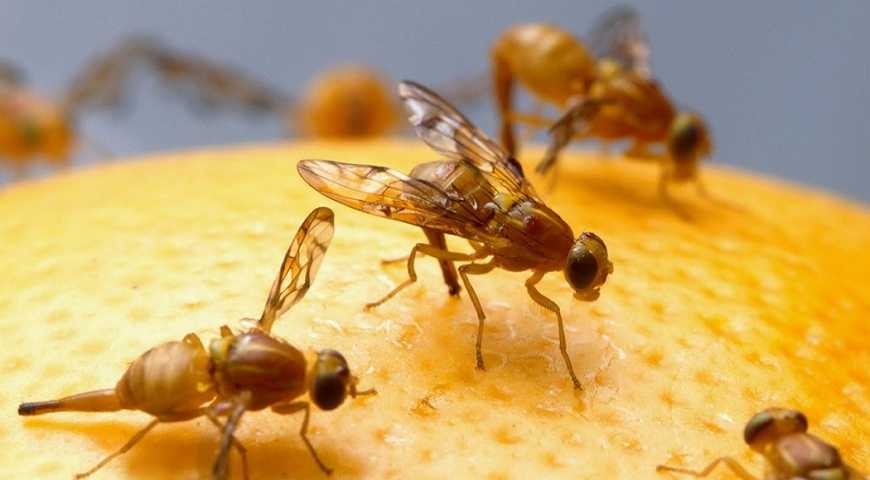 Самая распространенная разновидность домашней мошкары – дрозофилы. Когда вы думаете, как избавиться от маленьких мушек на кухне, вы размышляете именно о них. Подобные паразиты обычно селятся на «мягких» и сладких продуктах питания типа слегка подгнивших фруктов и овощей, варенья, сиропов, соков. Также их часто называют плодовые маленькие мушки.
