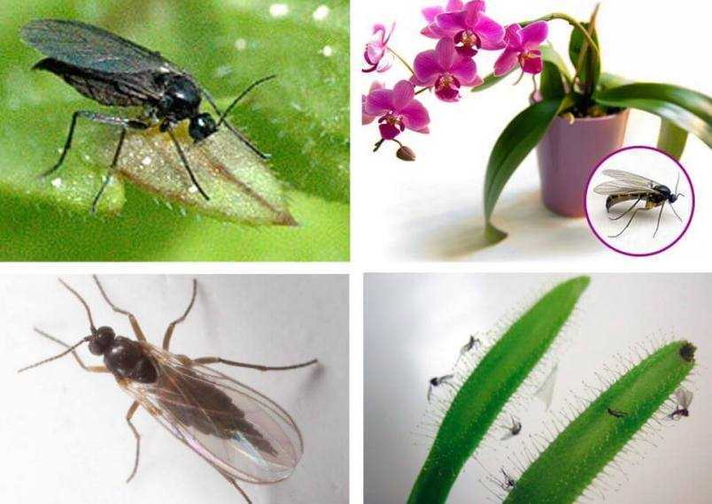 Дихлофос. Насекомые гибнут со временем от его воздействия, так как препарат угнетает нервную систему насекомых.Известна инструкция, позволяющая с помощью дихлофоса извести не только особей, обитающих снаружи, но и личинок, развивающихся в земле комнатных растений. Для этого необходимо выждать время, пока грунт станет сухой и разрыхлить землю. На вазон с растением надеть пакет, который необходимо зафиксировать на нужной высоте, чтобы он не смял листья. Распылить в землю дихлофос. Плотно завязать пакет. Выждать 5 часов. Повторить процедуру спустя 1 неделю.