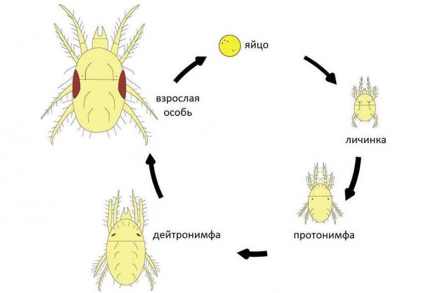 Из яиц через неделю вылупляются личинки, а через 2-3 недели появляются новые репродуктивные особи, и начинается новый захват территорий. На этом этапе во время перемещения вредителей химические средства борьбы могут быть наиболее эффективными. Когда клещи находят подходящее местоположение, они впиваются челюстями в части растения, начиная питаться его соками, содержимым клеток вместе с хлорофилловыми зёрнами, и перестают передвигаться.