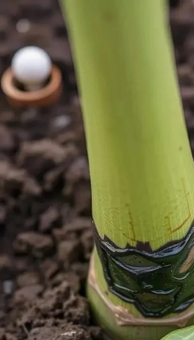 У основания стебля может появиться темная, мягкая гниль. Стебель становится хрупким и легко ломается. Гниль может распространяться вверх по стеблю, поражая все больше и больше тканей. Это свидетельствует о серьезном поражении корневой системы.