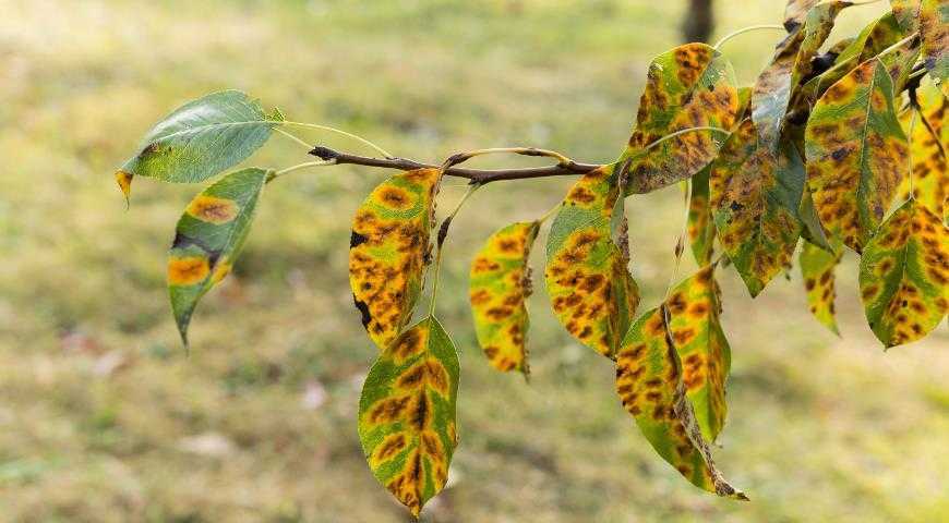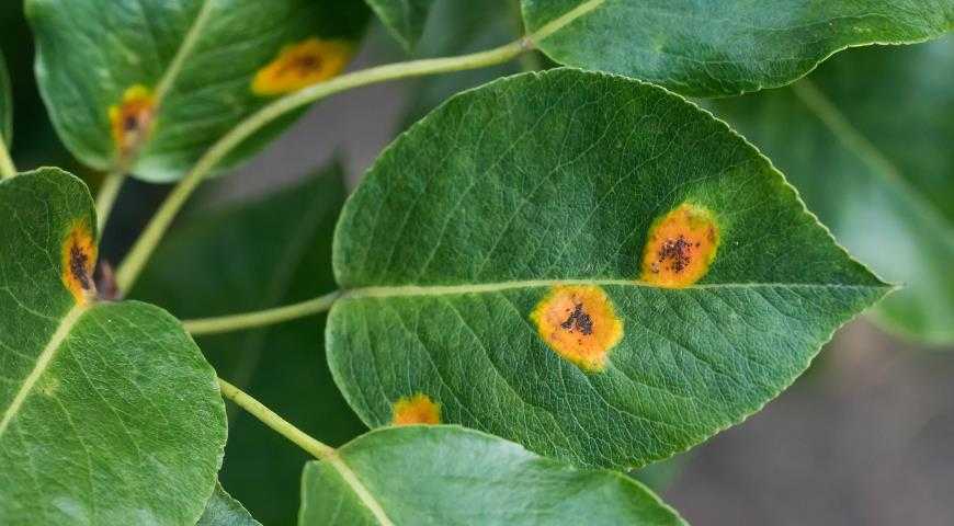 Плодовые деревья, включая яблоню и грушу, грибок также не обходит стороной. Сперва на верхней части листьев появляются буроватые пятна округлой формы, увеличивающиеся со временем. Если не предпринимать никаких мер, то к середине лета на нижней части листов начнут образовываться звездообразные наросты, а сами листья опадут раньше времени.