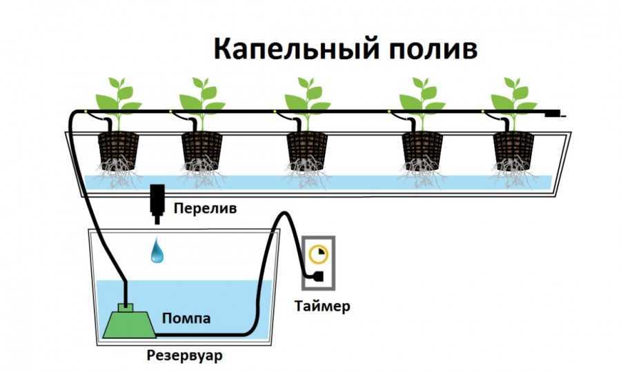 В емкость вода при капельном поливе поступает из водопровода и магистральной трубе с ответвлениями.