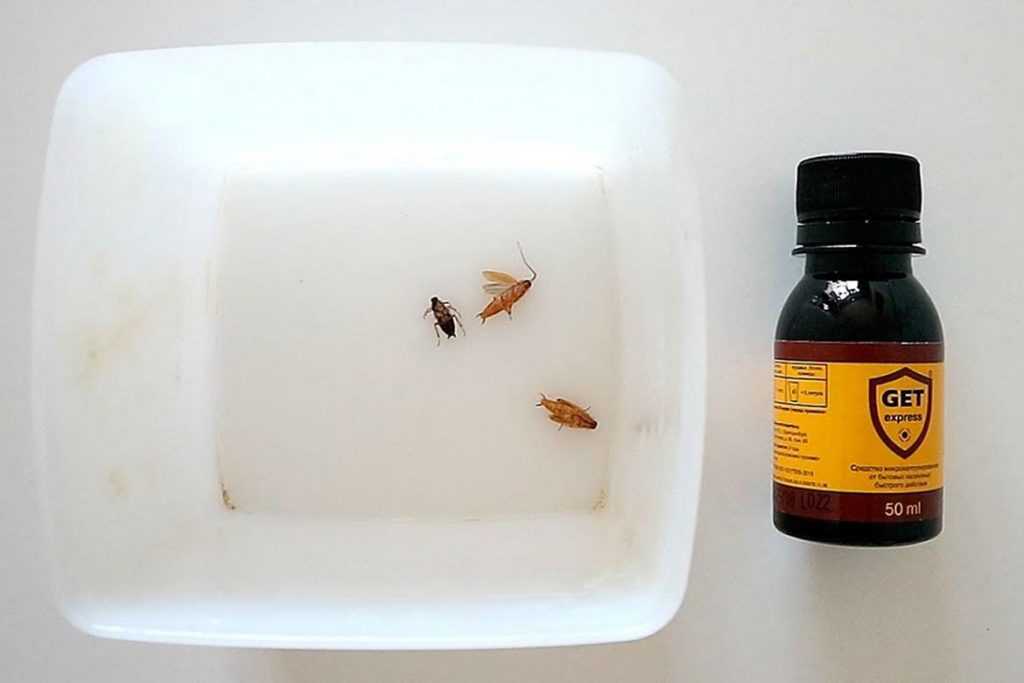 Get средство от тараканов данного вида отличается составом. Активный компонент тоже один – лямбда-цигалотрин. Это инсектицид, его концентрация в составе эмульсии составляет 1%. Дополнительно используется синергист – дикарбоксимид. Это вещество, усиливающее действие инсектицида, за счет чего повышается эффективность обработки. Средняя цена средства Экспресс – 1020 руб.