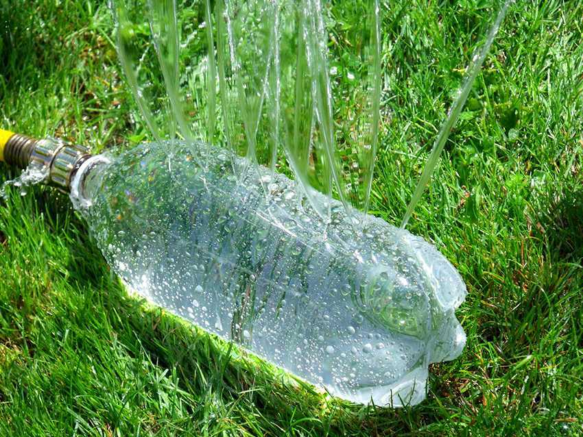 Самый простой и экономичный распылитель — из пластиковых бутылок. Гвоздём, шилом или дрелью с самым тонким сверлом в двухлитровой бутылке с одного бока, максимально близко друг к другу, проделываются отверстия. Герметично соединить шланг с бутылочным горлышком можно при помощи переходника, влагостойкого клея и проволоки. Переходник на шланге должен совпадать диаметром с крышкой от бутылки. Соединив концы шланга с бутылкой и с источником воды, получают распылитель для полива маленькой грядки или клумбы. Вставив в отверстия половинки от раскрученных пластиковых ручек, получают более мощный ороситель для кустарников.