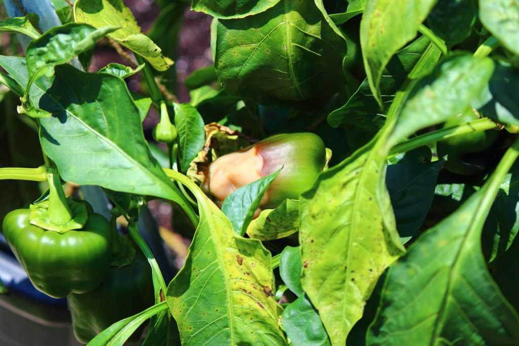 Велик риск получения растениями ожогов, особенно, если проводили дождевание или опрыскивание по листьям. В теплицах желтеют листья от ожогов, ведь в знойные дни пленка, стекло, капли воды на перцах играют роль увеличительного стекла.